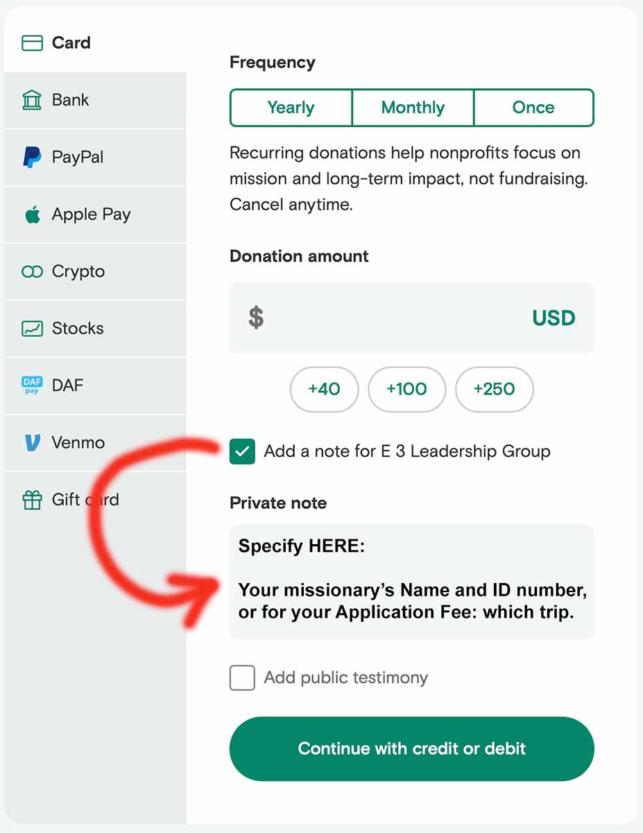 Check the box on the form to “Add a note for E 3 Leadership Group“, then specify your missionary’s name and number (if you have it) before you complete payment. If you’re applying for travel, please note for which trip you are submitting funds. Choose from PayPal, Apple Pay, Crypto, Stocks, Venmo, or even your personal Bank to submit funds.